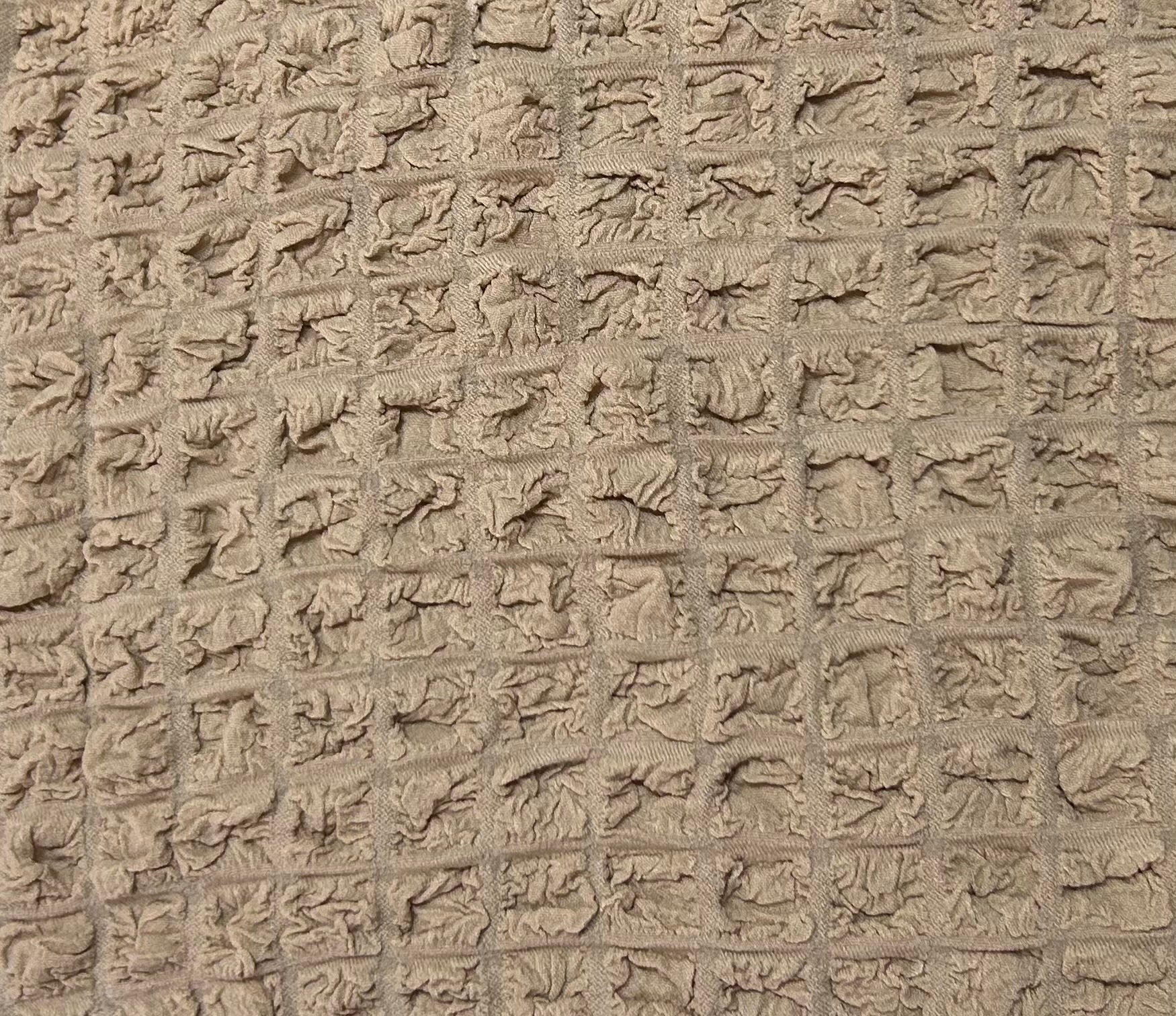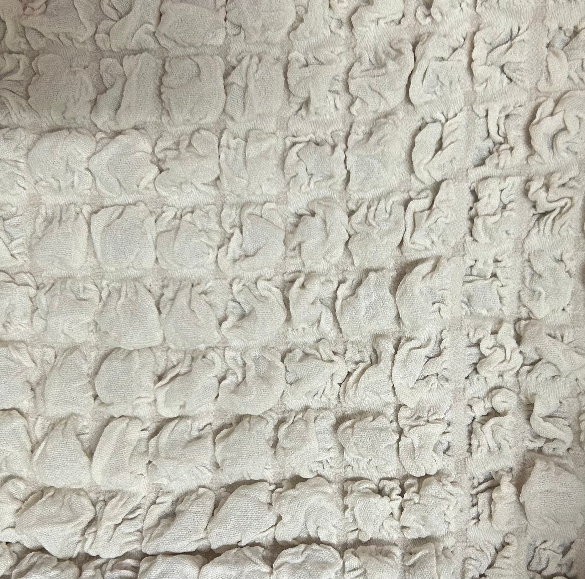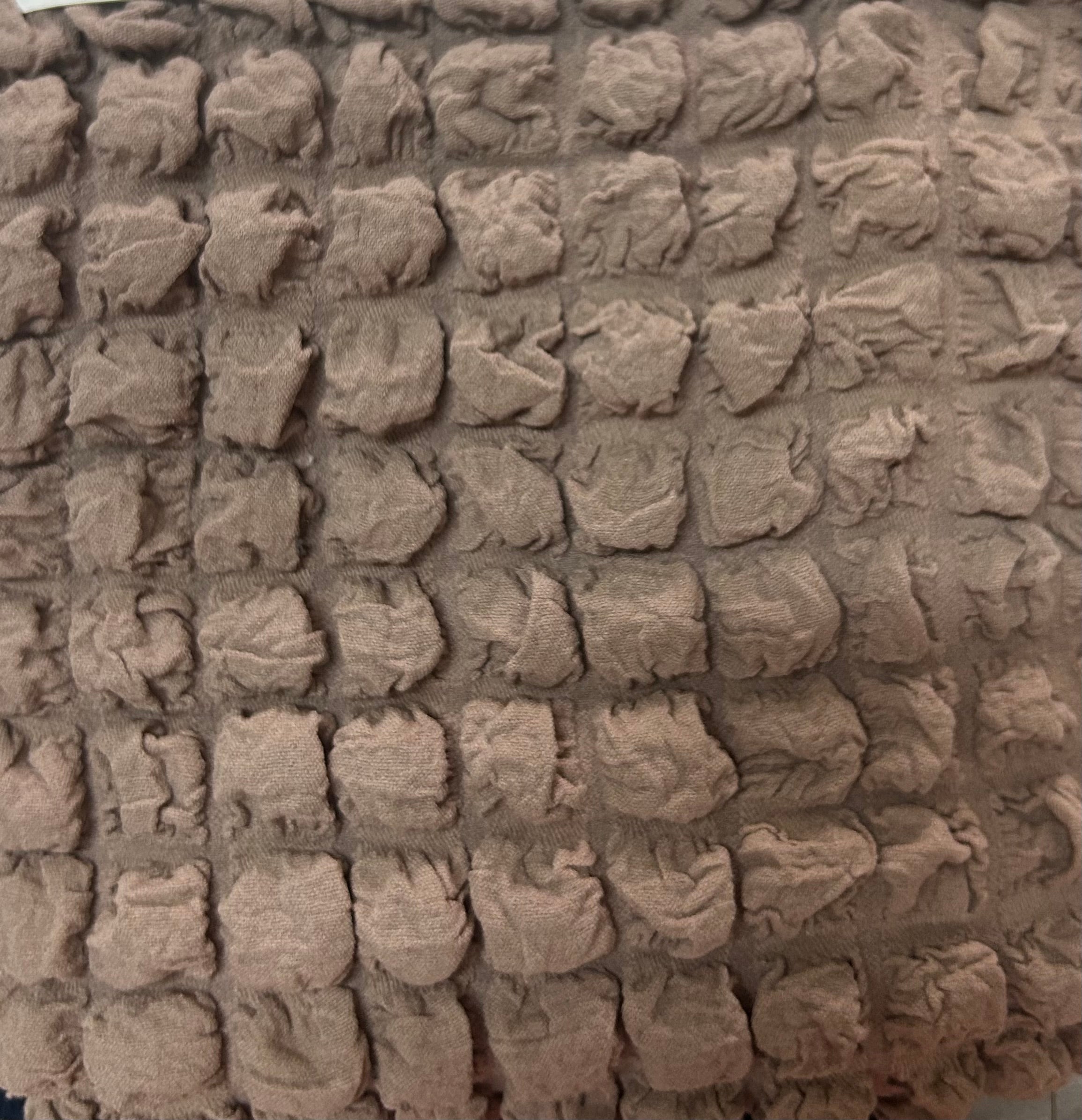Il design è arricchito da una lavorazione a bolle sulla superficie che dona un tocco raffinato e accogliente all’ambiente. La parte inferiore presenta una gonna arricciata, ideale per coprire completamente la base del divano e aggiungere un dettaglio decorativo.