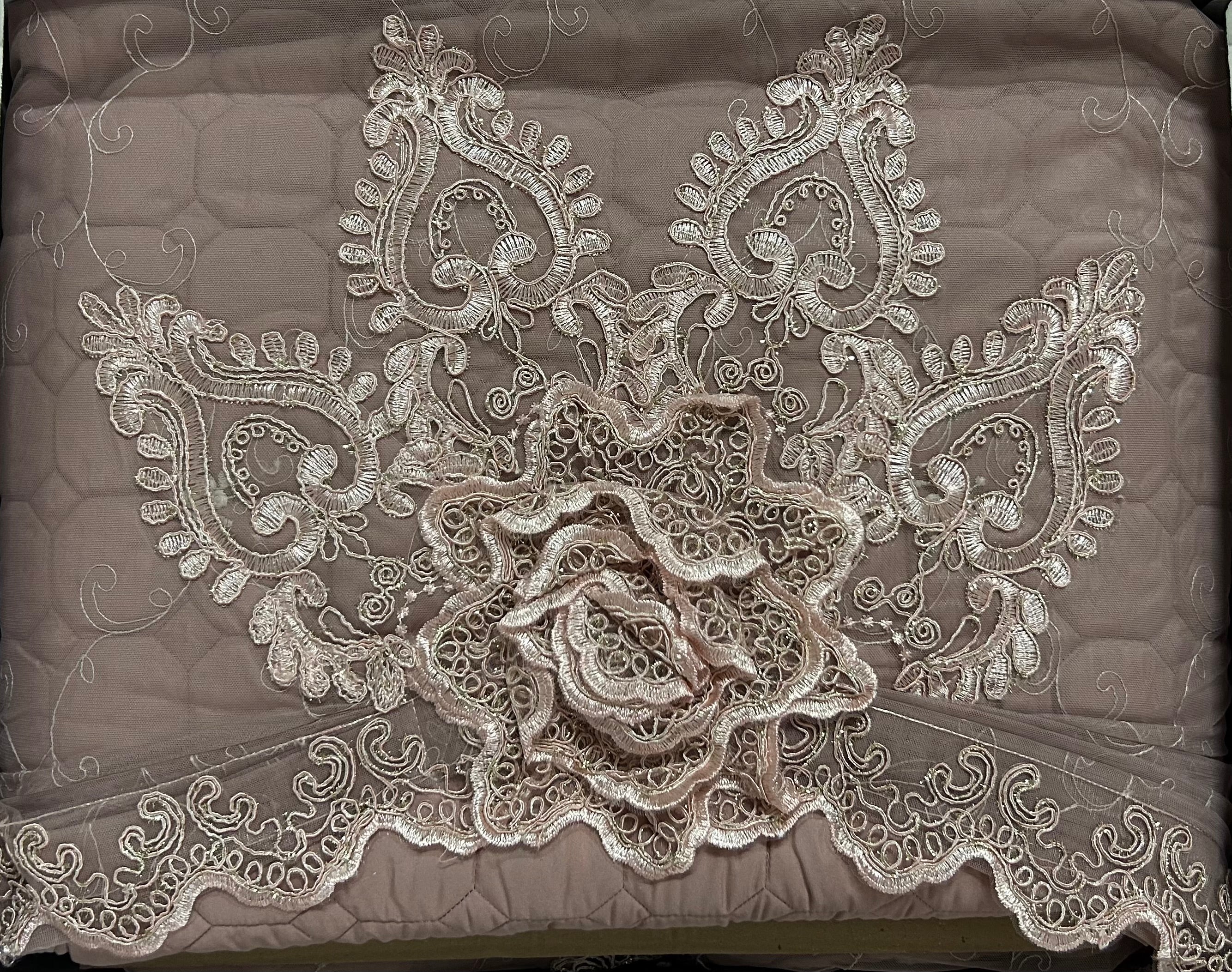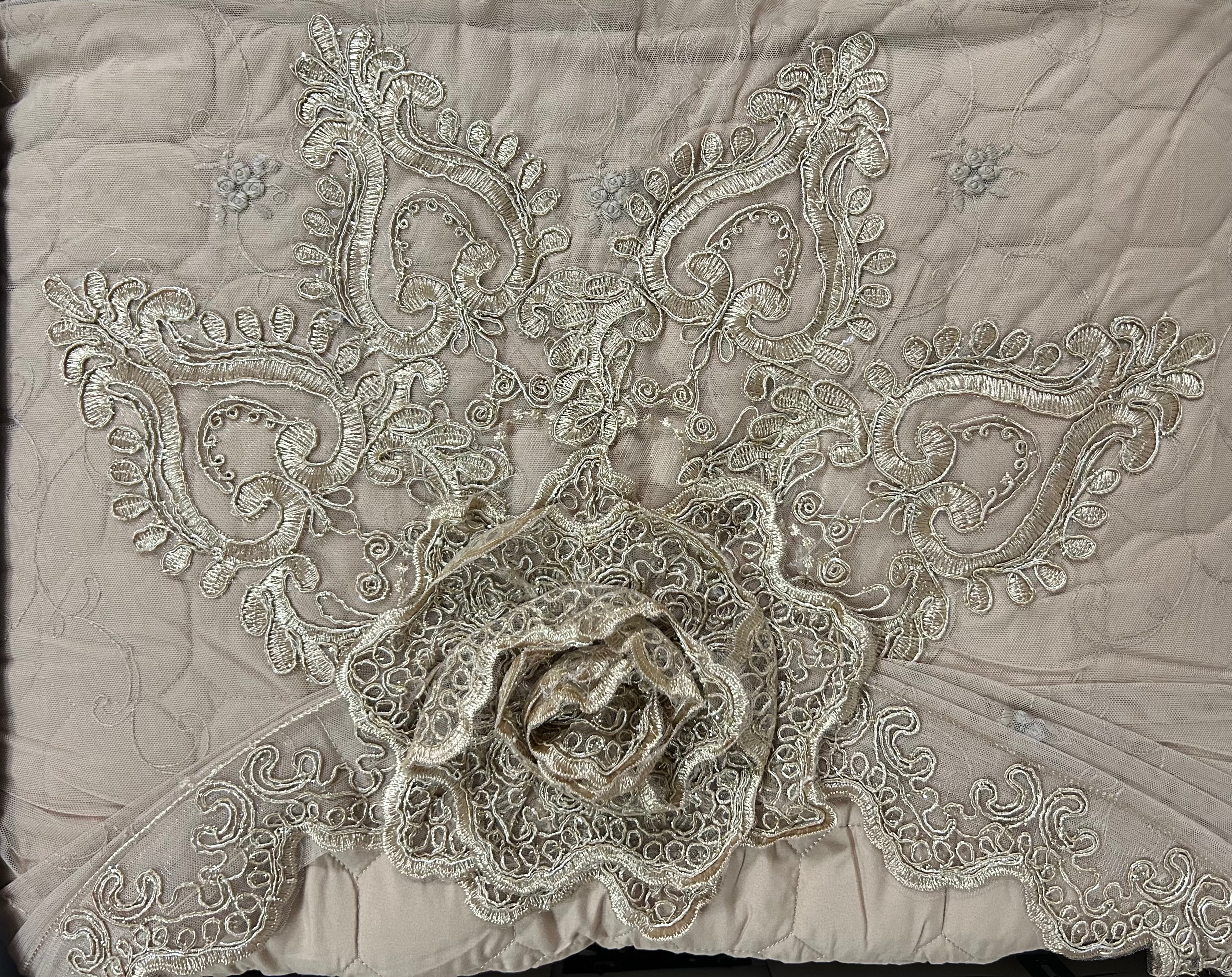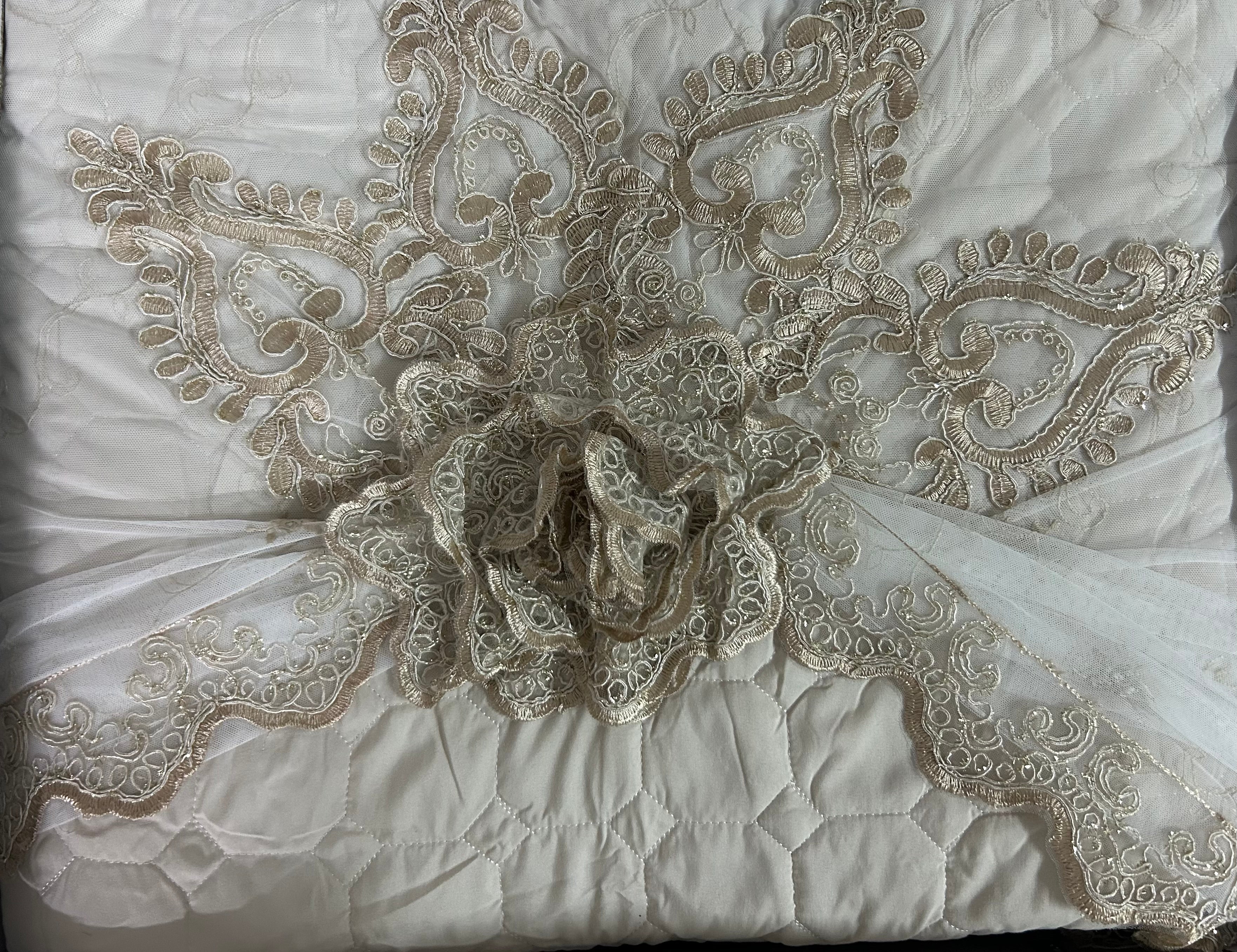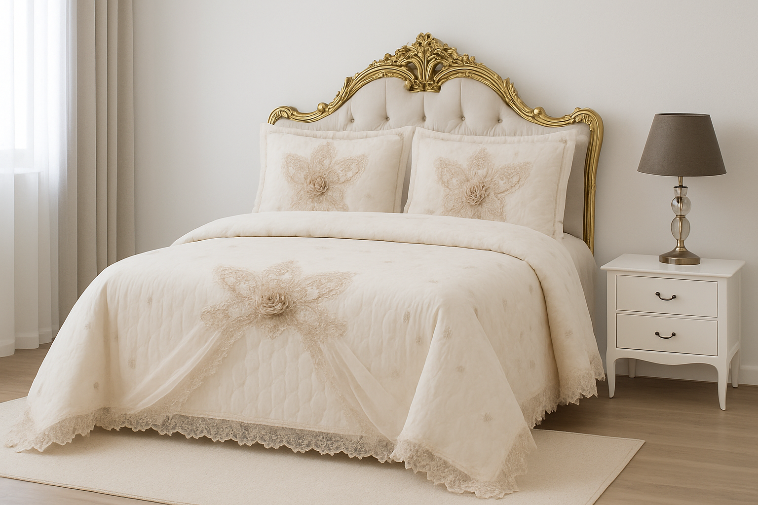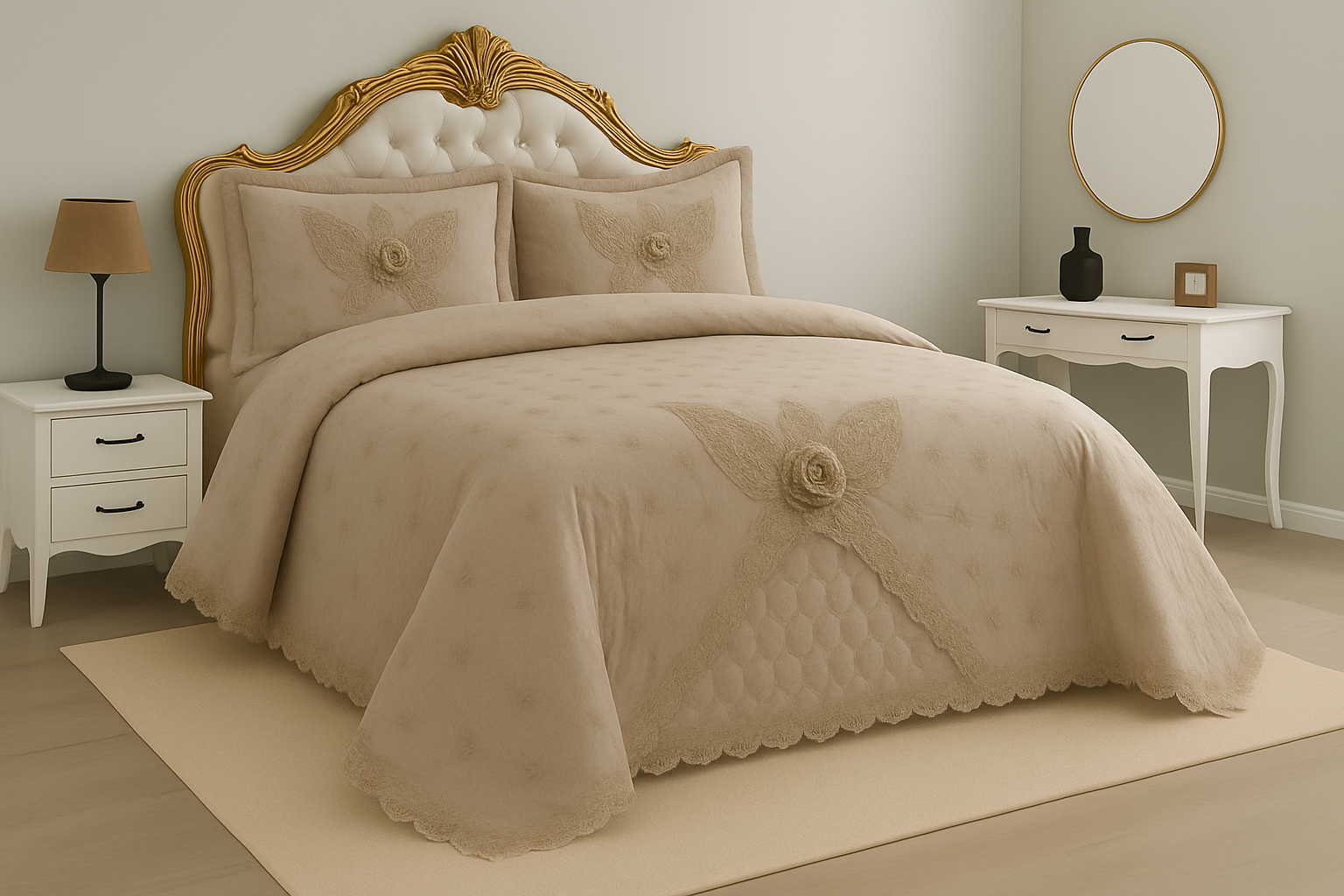 Rendi la tua camera da letto un ambiente raffinato e accogliente con questo elegante trapuntino matrimoniale completo di federe. Realizzato in morbido tessuto color panna, è impreziosito da delicati ricami floreali in pizzo con applicazioni in rilievo, che donano un tocco di lusso e romanticismo.